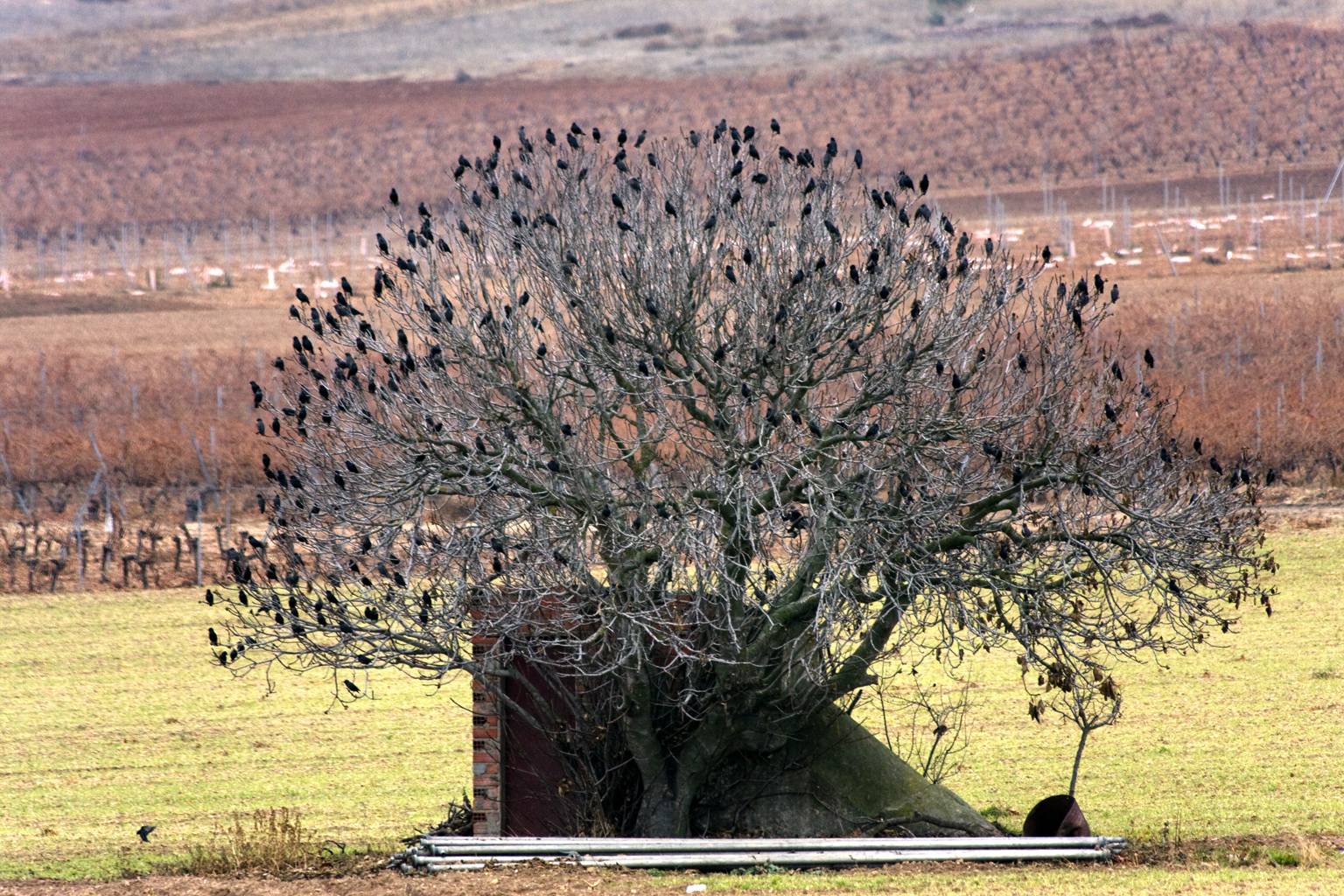 Cual árbol de Navidad, así aparecía este arbolito ocupado enteramente por una bandada de tordos.
